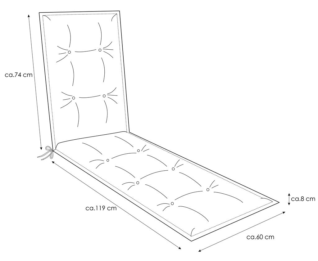 193 cm lang (Rücken: 74cm, Sitz- / Fußteil: 119 cm), 60 cm breit, 8 cm dick