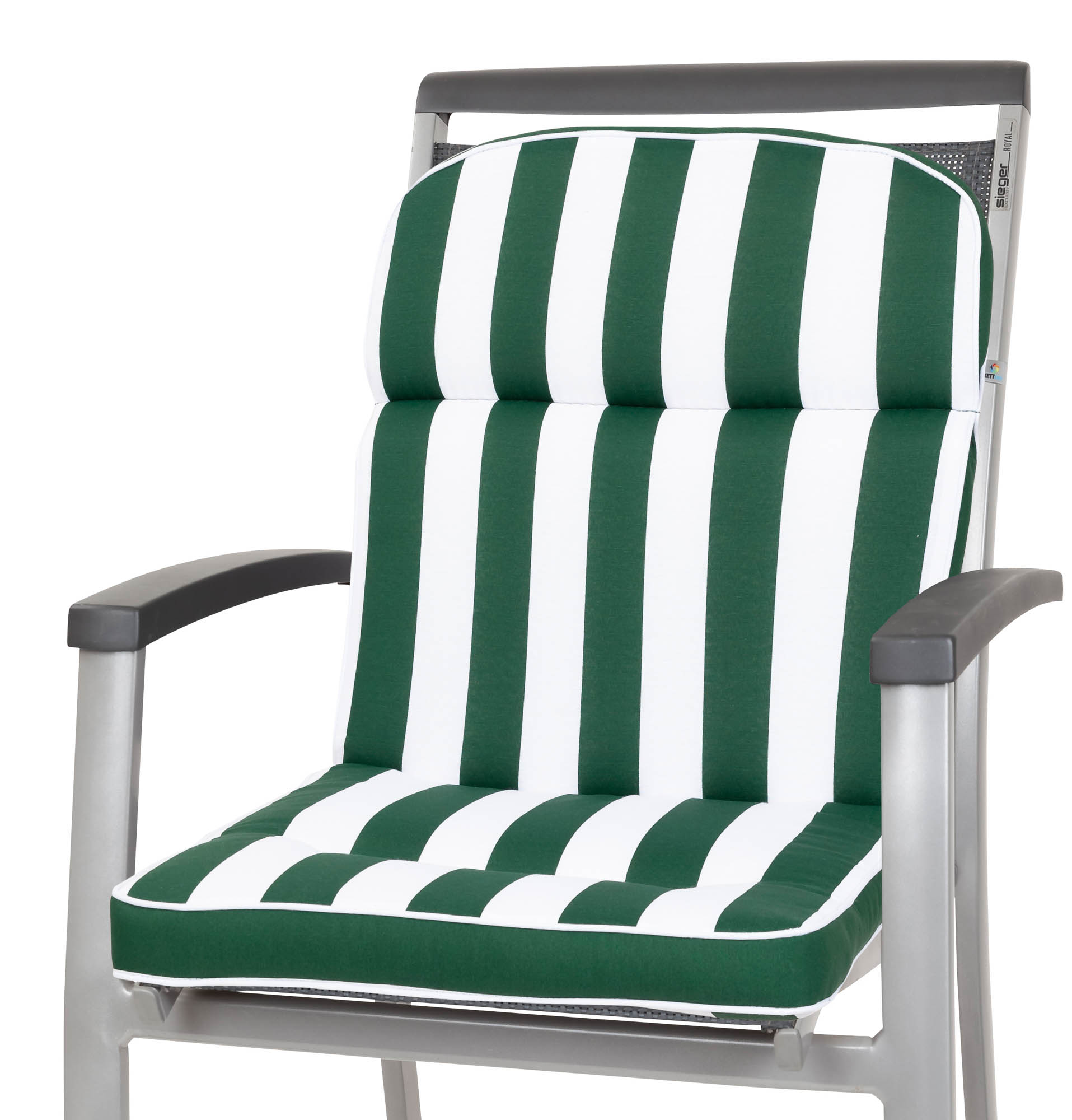 Dessin 2154, grün-weiß gestreift 70% Baumwolle, 30% Polyester Stegkissen mit doppeltem Keder, Quersteppung verstellbares Halteband im Rücken, 2 Bindebänder im Lehnenknick 100 cm lang (Sitz: 48 cm, Rücken: 52 cm), 50 cm breit, 7 cm dick Handwäsche