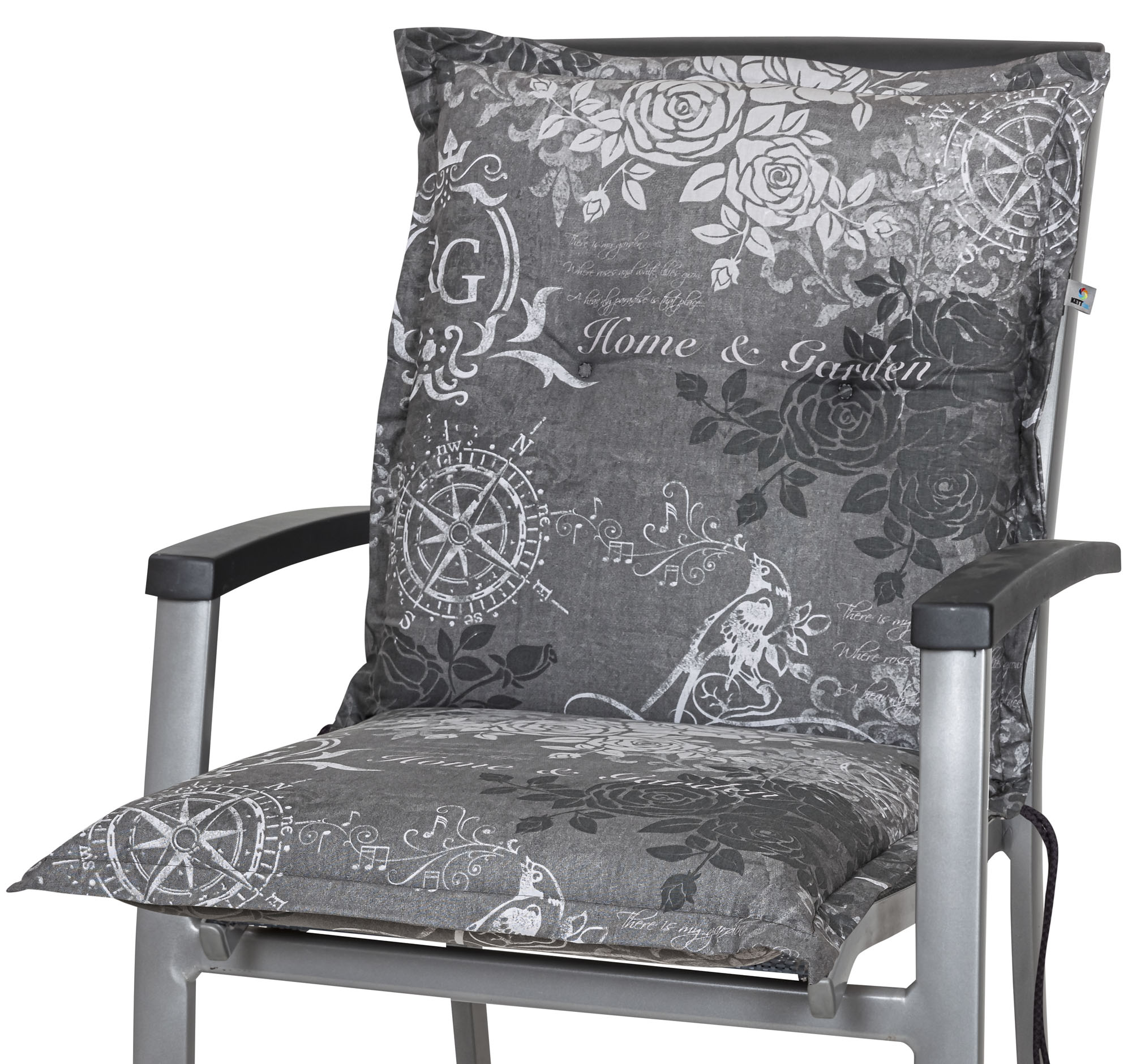 Modell: Bali Dessin 2384, grau Rosen Royal Garden 100% Baumwolle verstellbares Halteband im Rücken, Bindebänder im Lehnenknick Maße (inkl. Stehsaum): ca. 100 cm lang (Sitz: 49 cm, Rücken: 51 cm), 50 cm breit, 8 cm dick Handwäsche