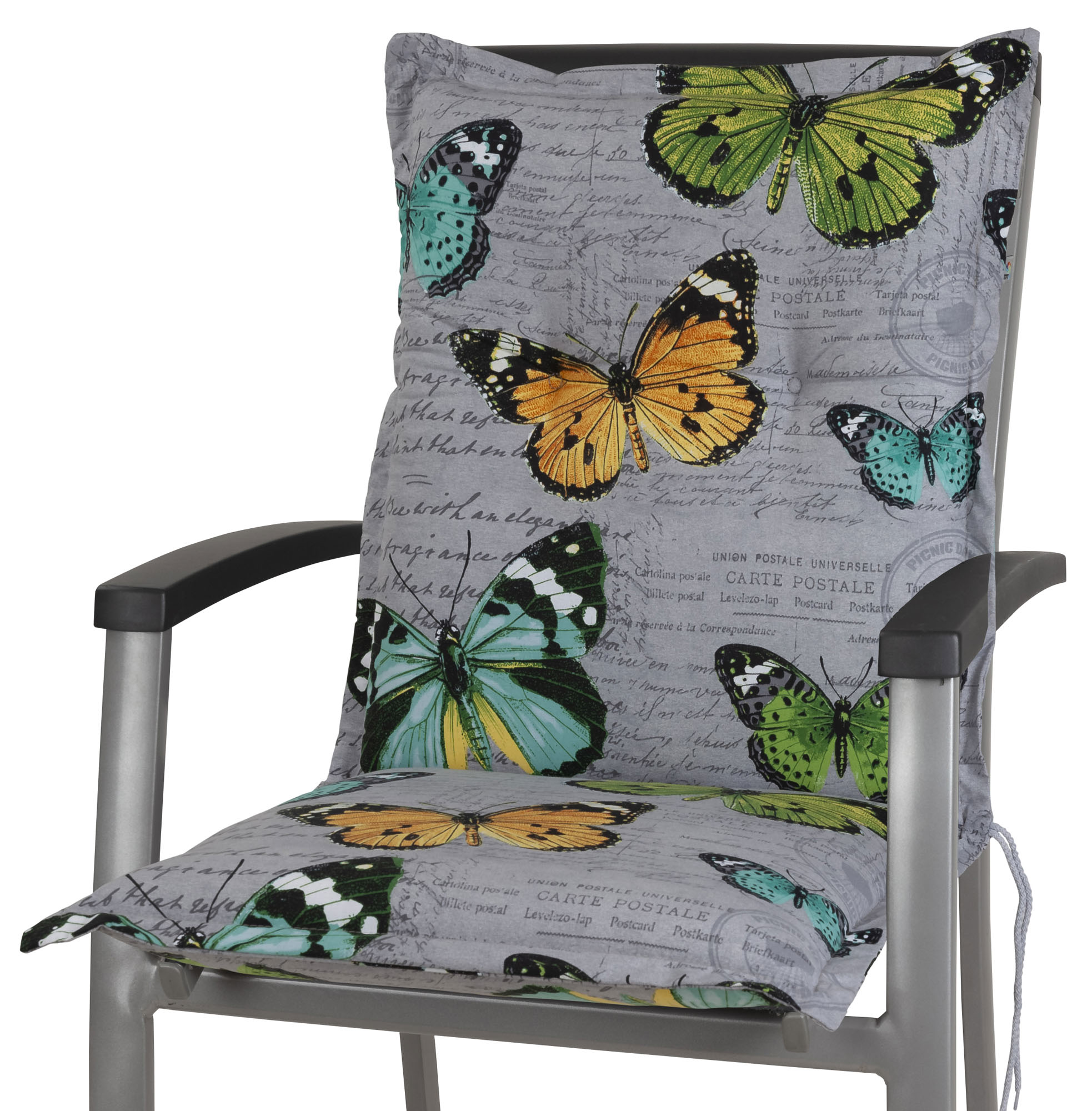 Modell: Bali Dessin 2467, hellgrau, bunte Schmetterlinge 100% Baumwolle verstellbares Halteband im Rücken, Bindebänder im Lehnenknick Maße (inkl. Stehsaum): ca. 103 cm lang (Sitz: 48 cm, Rücken: 55 cm), 50 cm breit, 8 cm dick Handwäsche