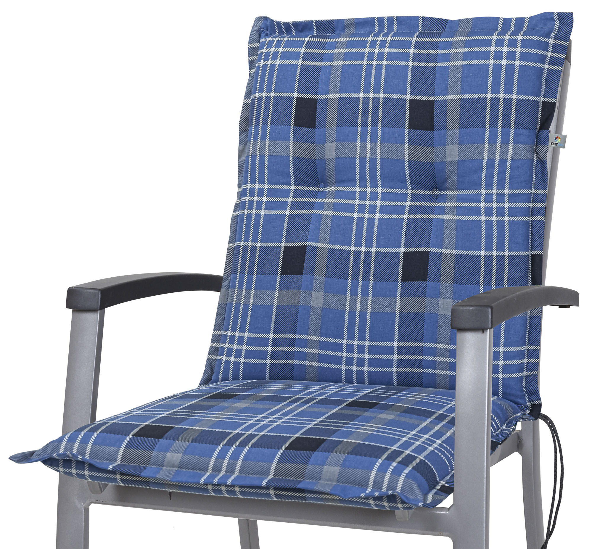 Modell: Milano Dessin 2394, blau-grau kariert 100% Baumwolle verstellbares Halteband im Rücken, Bindebänder im Lehnenknick Maße (inkl. Stehsaum): ca. 102 cm lang (Sitz: 49 cm, Rücken: 53 cm), 49 cm breit, 6 cm dick Handwäsche